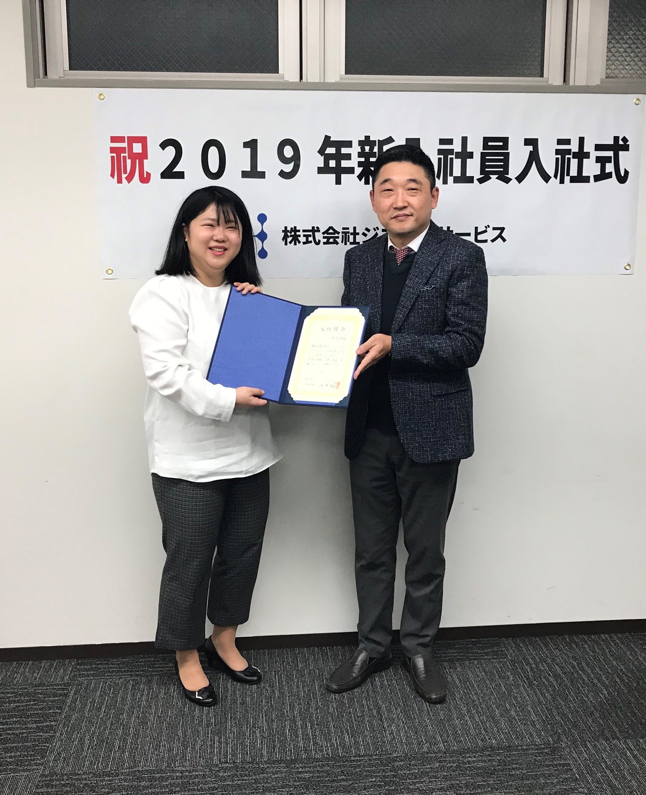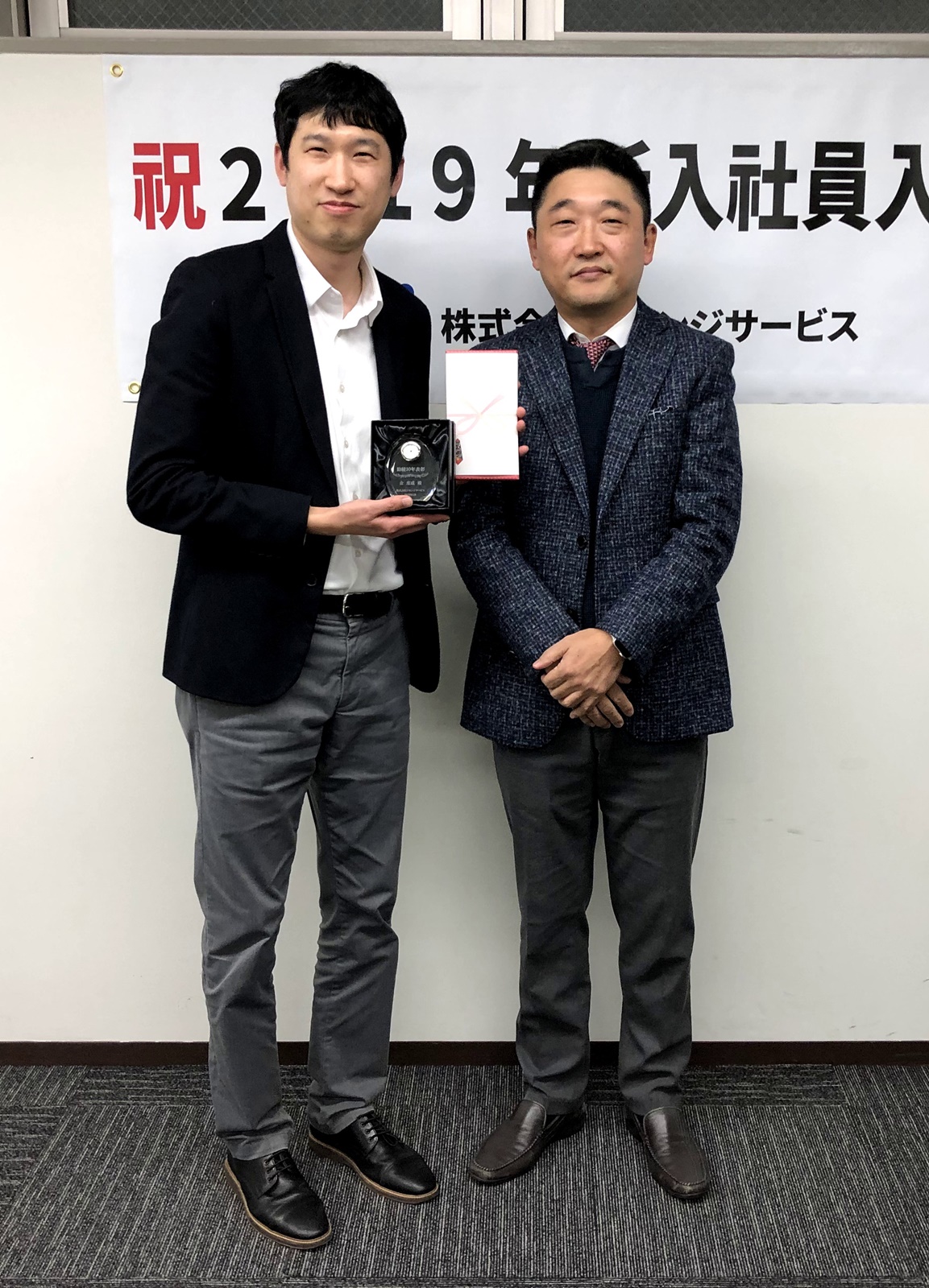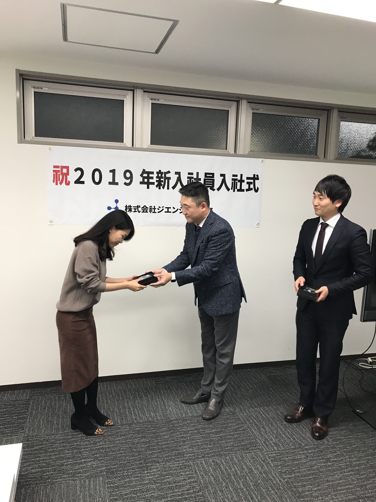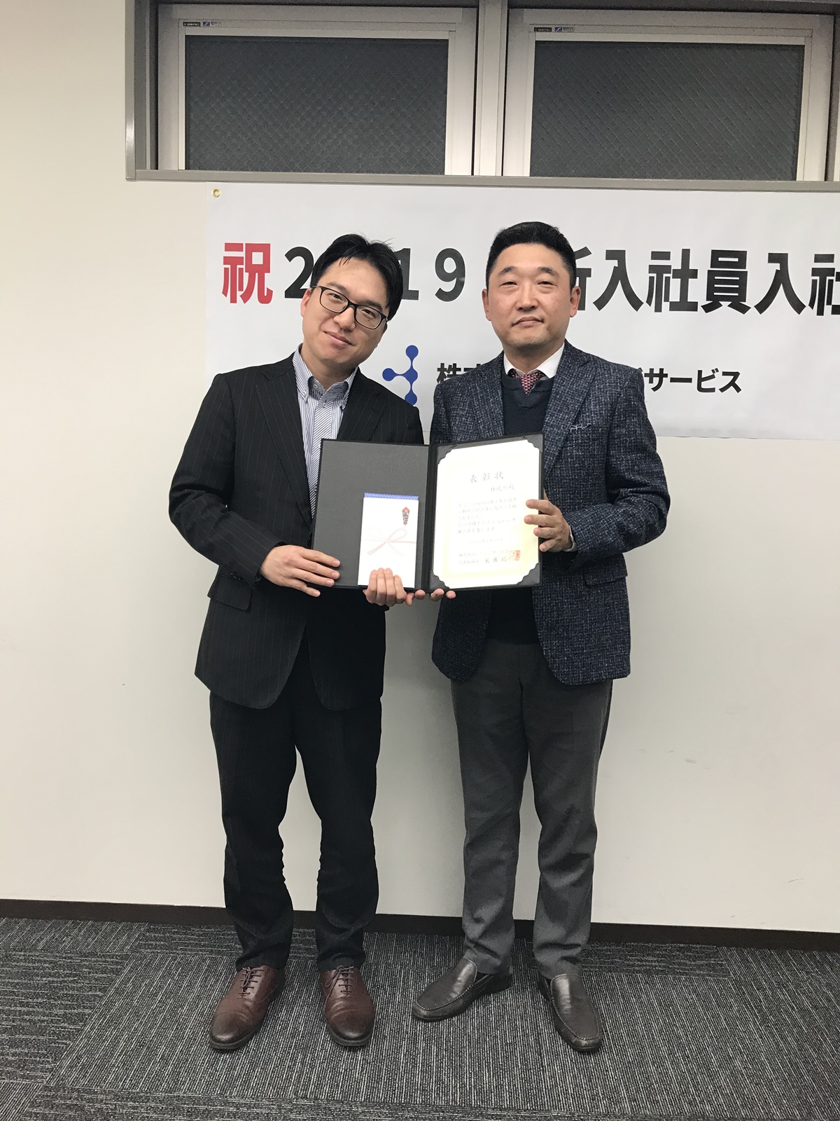 1月31日、本社にて2019年度新人社員入社式および永年勤続者表彰式を行いました。2019年度下期の新人社員は4名ですが、この日には在留資格関係で遅れてきた1名の入社式でした。